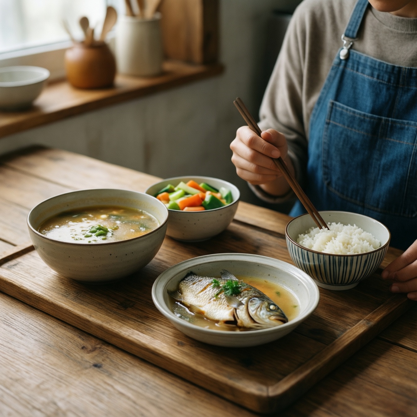 • Опора на простые базовые продукты: рис/греча/лапша, овощи, рыба/птица/тофу, бульоны, ферментированные продукты.