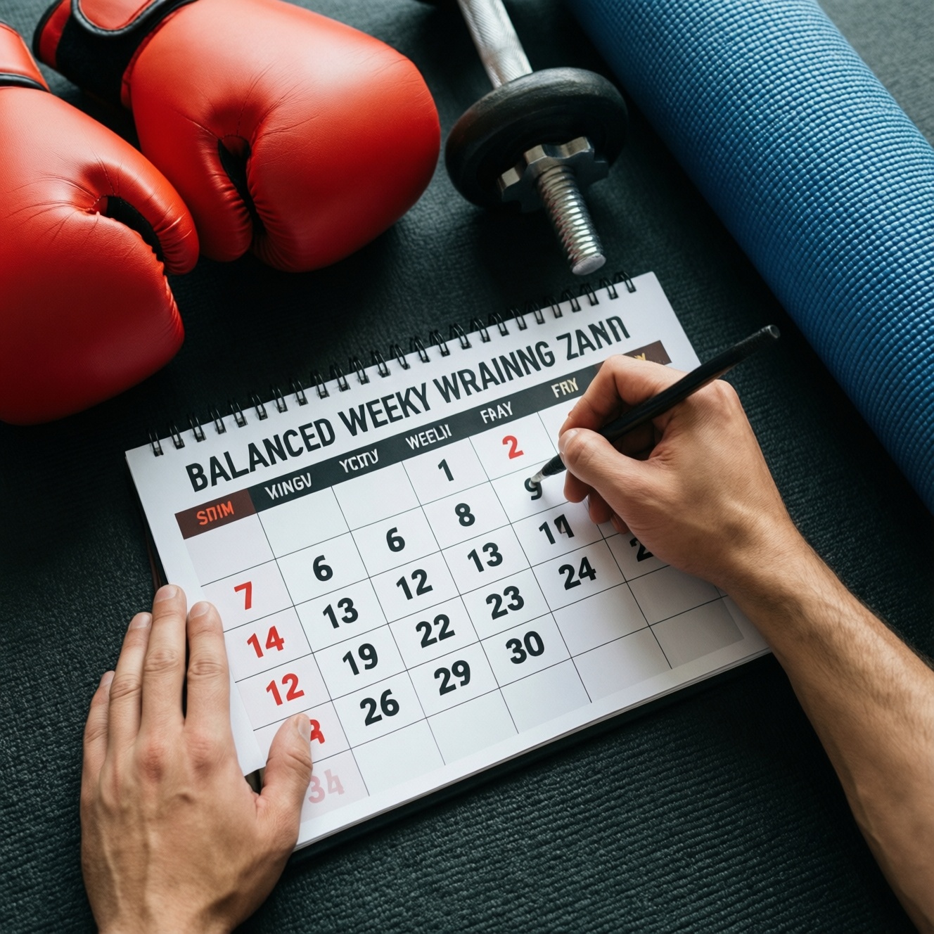 Чтобы распределить спарринги, силовые и йогу без перегруза, соберите недельный план тренировок вокруг 2 "тяжёлых" дней, 2-3 "лёгких" сессий и 1 полного дня восстановления. Интенсивность фиксируйте через RPE и (для силовых) % от 1RM, а спарринги дозируйте длительностью и плотностью раундов. Корректируйте план по маркерам сна, боли и падению скорости.