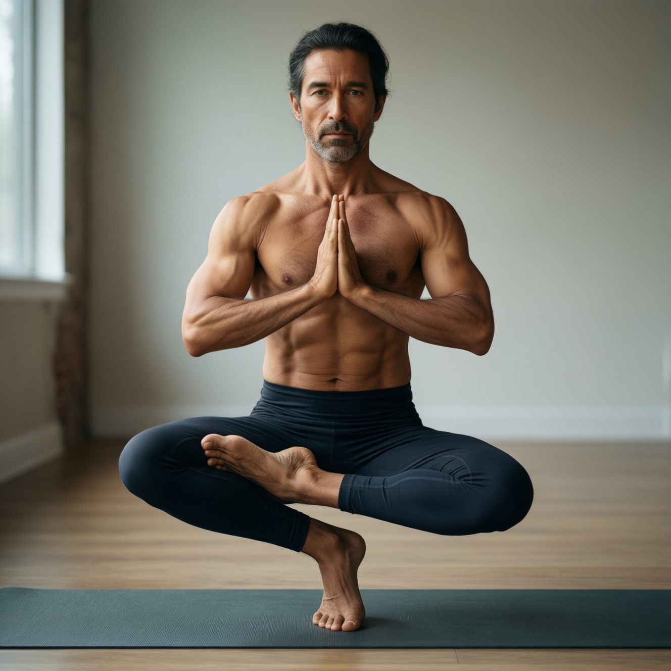 3. Баланс: Врикшасана у стены (стопа-таз-ребра). 30-45 секунд на сторону, пальцы рук слегка касаются стены. Маркеры: опорная стопа "трипод", таз не заваливается, дыхание не сбивается.